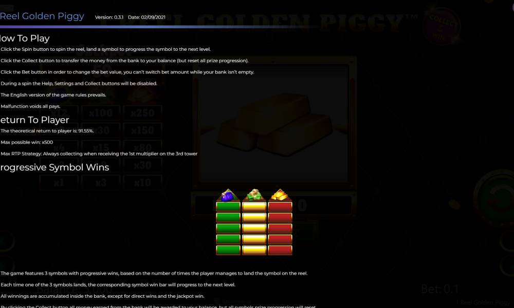 Максимальная ставка в слоте 1 Reel Golden Piggy равна 10 долларам.