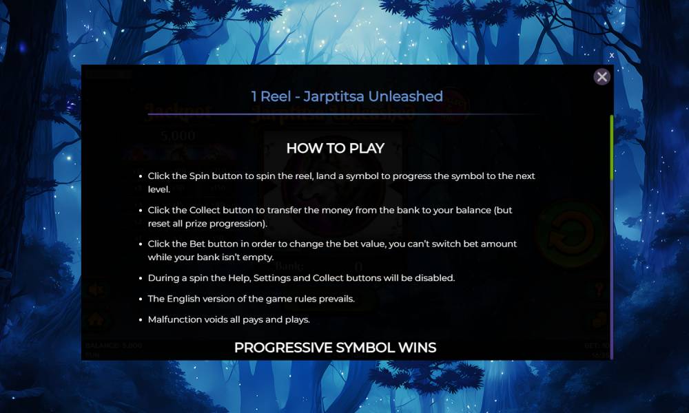 В 1 Reel Jarptitsa Unleashed есть всего 1 ячейка без линий, в которой может выпасть 5 знаков: 3 простых, каждый со своей ценой. Еще 1 Wild, который заменяет все 3 обычных. И символ, который мешает игроку выиграть. Символы в ячейке могут показываться не целиком: в этом случае действия (выплата или проигрыш) не происходит, и спин тратится впустую. Слева находится отдельное поле с 15 ячейками: 3 ряда по 5 в каждом. В них написаны множители: от х1 до х12 в левом, от х3 до х100 в правом, и от х10 до х250 в правом.