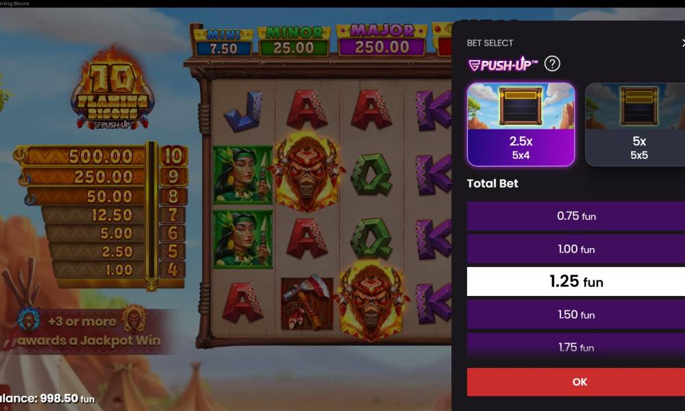 В 10 Flaming Bisons игровая сессия начинается с поля 5х3. Пользователь может сразу же увеличить размеры до 5х4 или 5х5, сделав дополнительную ставку. Количество линий при этом также возрастет. Доступный игроку максимум составляет 5х7 при 60 линиях, возможных лишь в режиме бесплатных вращений. Диапазон ставки составляет от 0.1 до 100 евро, при ограничении выигрыша в х5602. Игра использует 10 рядовых и 3 специальных символа. Также действует система моментальных призов, вносящая разнообразие в игровой процесс. Учет знаков для комбинаций проводится слева направо.
