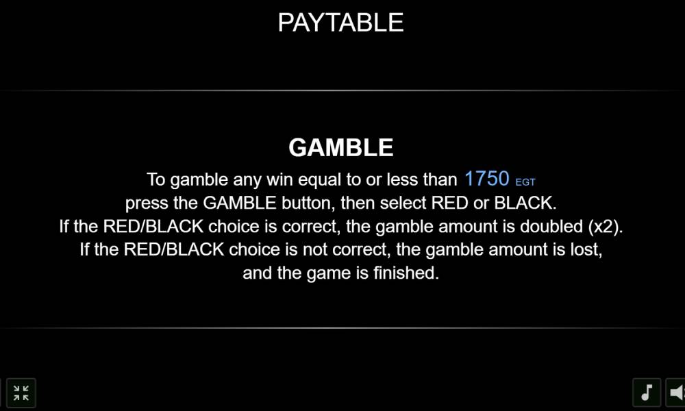 Gamble. Это риск-игра, которая приносит удвоение выигрыша или потерю денег. Запустить ее можно в любой момент после получения приза в базовом раунде. Нужно нажать на кнопку х2. Перед игроком появится карта рубашкой вверх. Нужно угадать — она красная или черная. Правильный ответ приносит х2 к полученной сумме и можно продолжать. Ошибка ведет к потере денег, полученных за спин, и возврату к барабанам. В любой момент после выигрыша игрок вправе забрать заработанную сумму (сделать это нужно до того, как был выбран цвет карты).