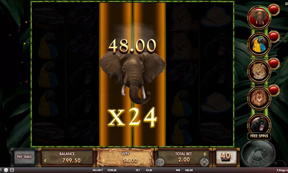 Игровое поле в 2 Kings of Africa несколько необычное и имеет размеры 5х5 с кластерной системой учета символов, от 5 одинаковых. Знаки должны соприкасаться по вертикали или горизонтали для образования комбинаций. Всего в игре их 4 старших, 4 младших и 1 джокер. Примечательно, что бонусы и фриспины могут быть активированы при помощи именно младших символов, имеющих самые низкие коэффициенты в таблице выплат (исключение составляет попугай). Ставка выбирается игроком среди значений от 0.8 до 20 евро. В обычном игровом режиме все специальные знаки с изображениями животных имеют свои счетчики, действующие на протяжении текущего раунда. При полном заполнении они дадут игроку стеки Wild знаков, огромные символы или множитель выигрыша.