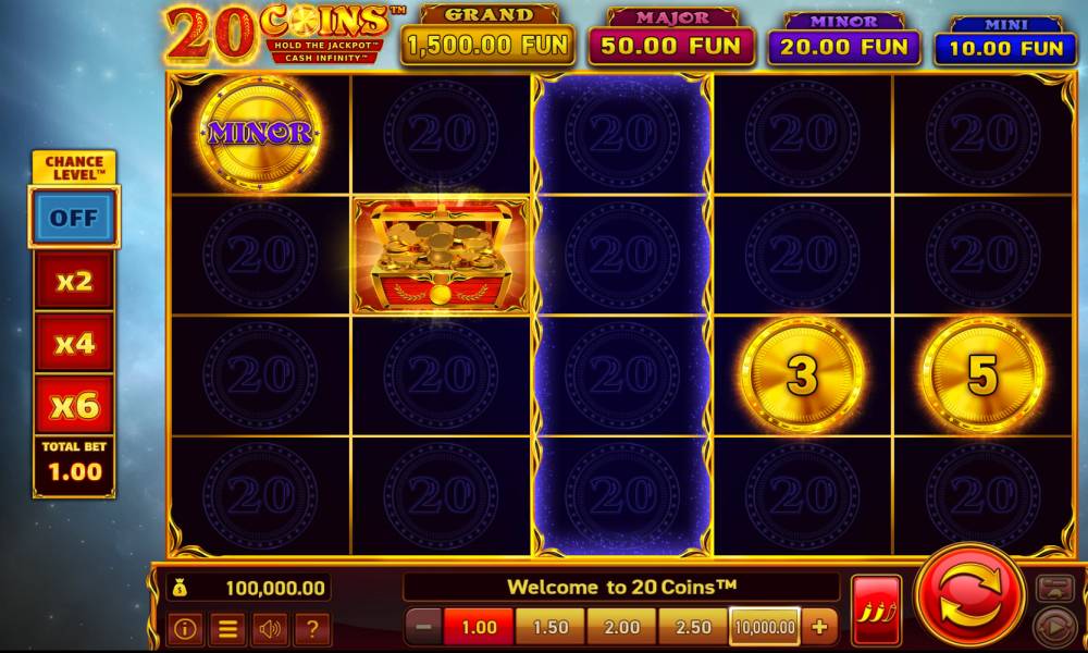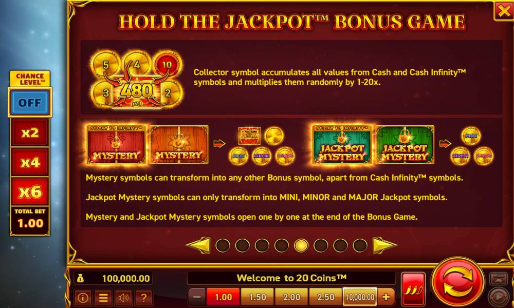 20 Coins от Wazdan — это слот с 5 барабанами и 4 рядами, где каждая ячейка вращается независимо. Игровое поле заполняют символы Cash, Cash Infinity, Mystery и Jackpot Mystery. Выигрыши формируются при выпадении бонусных символов, и основные выплаты происходят на бонусных барабанах Hold the Jackpot. Именно там вашим подарком может стать одни из четырех джекпотов. Максимальная ставка в слоте составляет 10000 монет, в то время, как минимальная всего 0.2 монетки. При этом максимальный выигрыш составляет аж до 1500х от ставки в моменте прокрута.