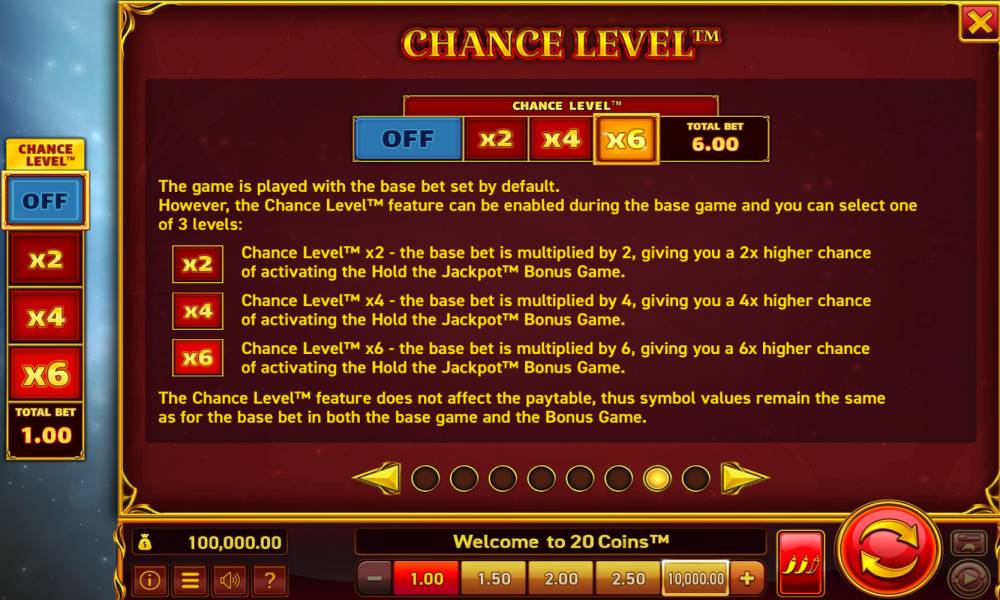 Chance Level увеличивает ставку в 2, 4 или 6 раз, повышая вероятность активации бонуса Hold the Jackpot.