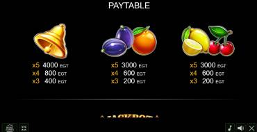 Игровое поле представлено сеткой 5х3. Автомат использует по 4 вида старших и младших знаков. Есть три специальных символа. Призовые комбинации составляются от трех штук на линии. Только знак семерки дает выплату за 2 символа. Цепочки должны быть собраны с первого барабана подряд. Всего в онлайн-слоте 20 выигрышных линий и они фиксированные. На спин можно ставить небольшие суммы. Автомат предлагает конвертацию монеты-евро (и другие валюты), но стоимость нужно узнавать в казино перед игрой. Провайдер добавил риск-игру и раунд Jackpot Cards. Максимальный выигрыш в базовом раунде ограничен суммой, в 5000 раз превышающей ставку на спин.