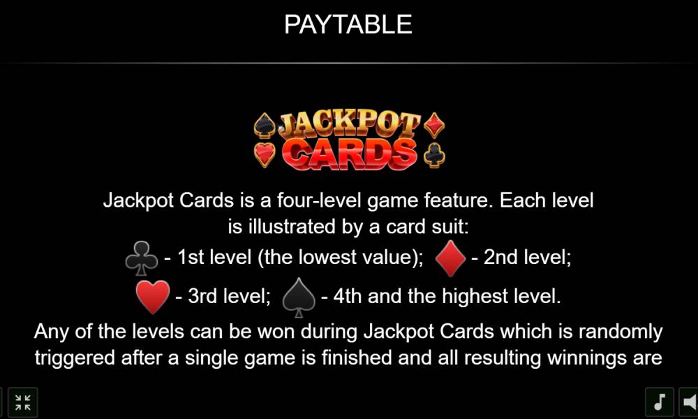 Провайдер добавил в онлайн слот раунд джекпотов. Он запускается в случайный момент. Перед пользователем появляются 12 карт, все рубашкой вверх. Их нужно открывать поочередно. Когда на поле покажутся три одинаковых по масти карты, игрок выиграл. Приз соответствует виду джекпота — трефы, бубны, черви, пики. Награда сразу выплачивается человеку, после чего он может вернуться к барабанам.