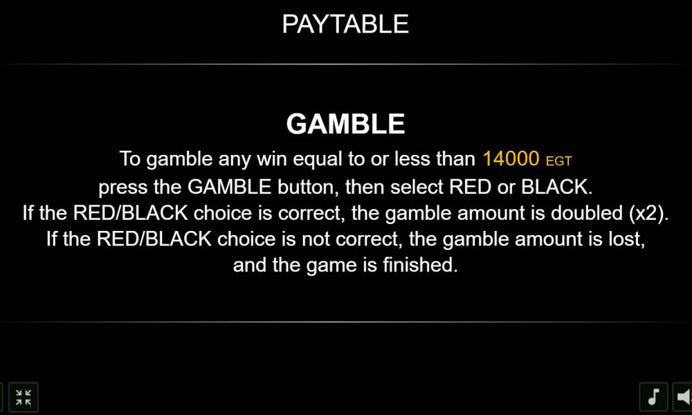 Gamble — это раунд, в котором игрок может удвоить полученный в базовой игре приз. Для этого нужно после удачного спина нажать на х2. Перед игроком откроется новое поле, где есть всего одна карта. Нужно угадать, она красная или черная. Правильный ответ приносит удвоение выигрыша. Игрок может забрать деньги или продолжить рисковать дальше. Если пользователь ошибся, то вся сумма сгорает.