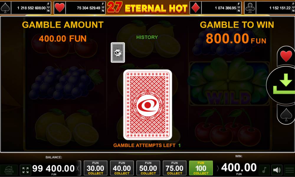 Четыре прогрессивных джекпота есть в онлайн-слоте 27 Eternal Hot. Они соответствуют карточным мастям, где наименьший — трефы, за ним идут бубны, третий по уровню — черви и самый крупный — пики. Шансы на получение джекпотов равны. Задача игрока переворачивать карты, которых 12 на экране, пока он не найдет три одинаковых. Нажимать на них можно в любом порядке, доверяя своей интуиции. После завершения раунда джекпот прекращает расти и зачисляется на счет пользователя.