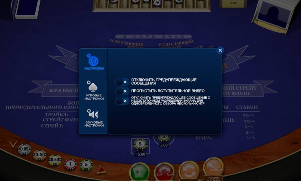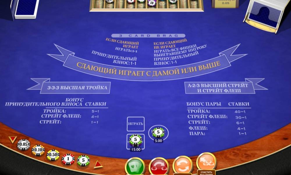 Ход игрыСначала нужно выбрать размер ставки и нажать кнопку начала раунда. После этого виртуальный крупье сдаст вам и себе по три карты. Вы увидите лишь свою комбинацию, потому что карты дилера будут лежать рубашкой вверх.