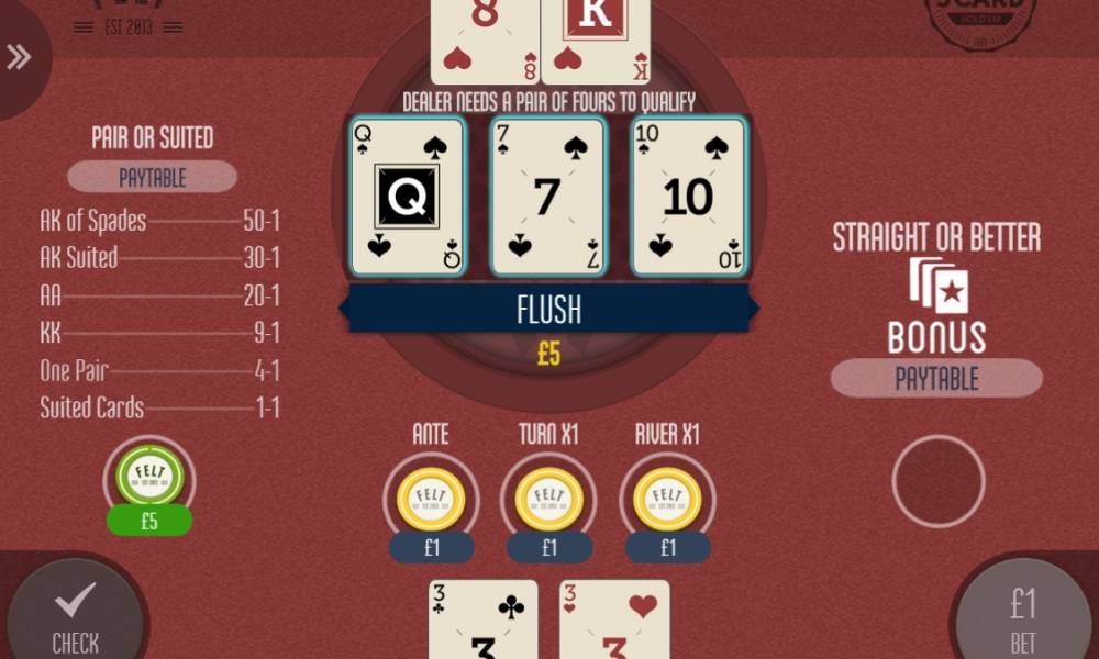 В игре действуют покерные комбинации, составленные из трех карт. Они выбираются из пяти доступных карт: две из них являются индивидуальными (карманными), а три выкладываются на стол и считаются общими. Клиент и дилер могут задействовать три любых карты из данных пяти.