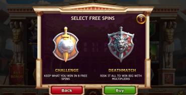 В слоте есть фриспины 2 видов: Challenge Free Spin Mode и Deathmatch Free Spin Mode. Гемблер может выбрать, какой из пакетов запустить. Есть 2 способа запустить раунд: поймать 3+ Scatter на любых ячейках, или купить за х50 от ставки через Buy Feature. Challenge-режим работает по тем же правилам, что и простые вращения. В пакет входят 8 ФС. В Deathmatch-режиме есть 3 уровня с разными условиями. Выбрать уровень может сам игрок. Также игроку нужно выбрать одного из 3 гладиаторов с бонусами от Gladiator Feature. Эти функции будут срабатывать в каждом вращении. Уровень 1 — 7 ФС с дополнительным множителем х2. Уровень 2 — 6 ФС с дополнительным множителем х3. Уровень 3 — 5 ФС с дополнительным множителем х4.