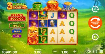 В 3 Pots Riches Extra: Hold and Win используется 30 фиксированных линий для составления выигрышных сочетаний символов. Игровое поле состоит из 5 барабанов, в 4 ячейки высотой каждый. Всего в слоте 4 старших и 4 младших знаков, не считая специальные символы. Учет комбинаций проводится традиционно слева направо. Игрок выбирает ставку из диапазона от 0.2 до 100 у.е.. Наибольший интерес представляют собой фриспины и бонусы. Именно тут можно сорвать максимальный куш с джекпота, он составляет х5000 от ставки.
