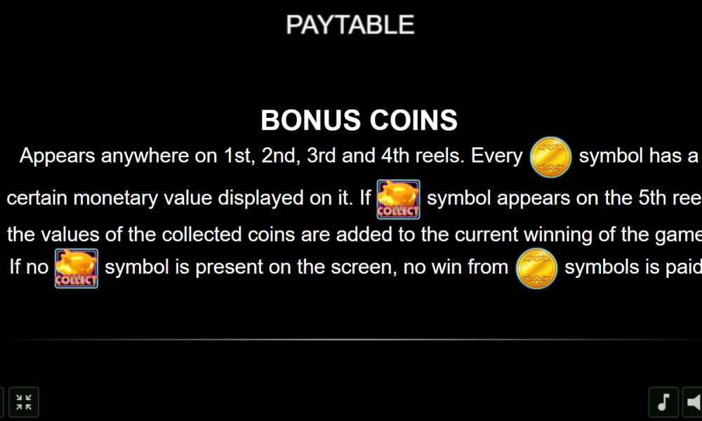Bonus Coin — выпадает на всех барабанах, кроме пятого. Имеет собственное денежное значение, которое всегда разное. Монеты оплачиваются только в том случае, если на последней катушке есть знак сбора.