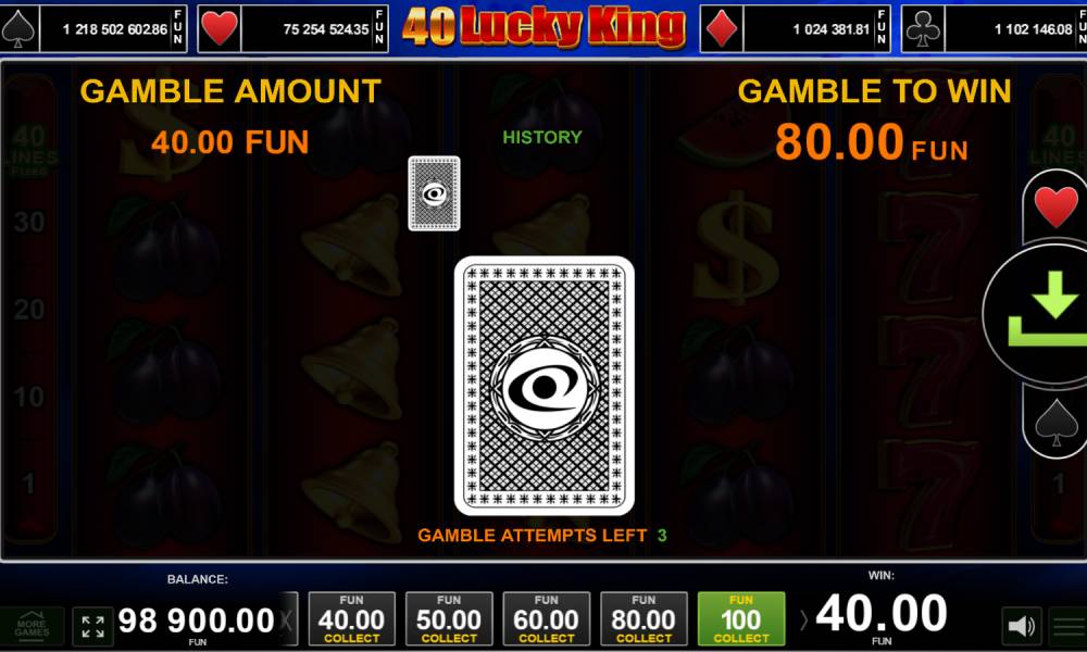 Формат игрового поля онлайн слота 40 Lucky King 5х4. Выплаты проводятся на фиксированных линиях слева направо. Все символы (по 4 вида старших и младших) приносят награду за 3-5 штук. Изображение семерки также даст приз и за 2 знака на линии. Помимо обычных спинов в автомате есть раунды Gamble и Jackpot Cards. Максимальный выигрыш составляет х1000 от ставки, которую можно выбирать от 0.4 до 100 евро.