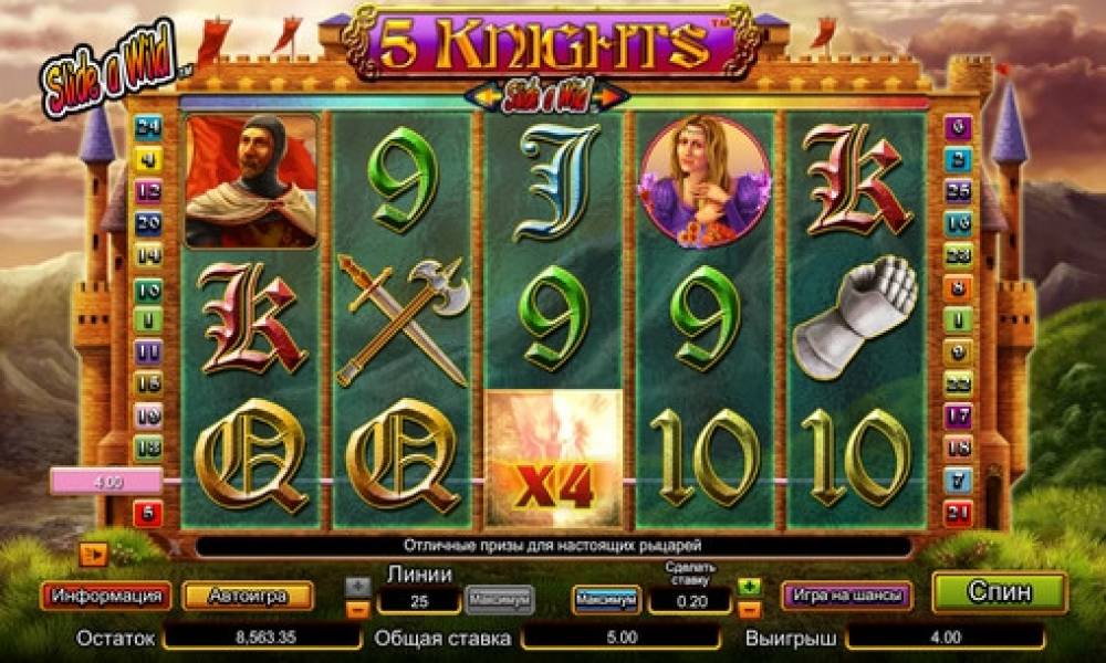 Видео-слот 5 Knights перенесет вас в эпоху отважных рыцарей, которые были готовы отважиться на любую авантюру и даже сложить жизнь ради любимой женщины. Это полностью русифицированный бесплатный игровой автомат с уникальной функцией Slide a Wild (о ней читайте ниже) и массой других интересных опций. Разработала и выпустила видео-слот компания Nextgen Gaming.