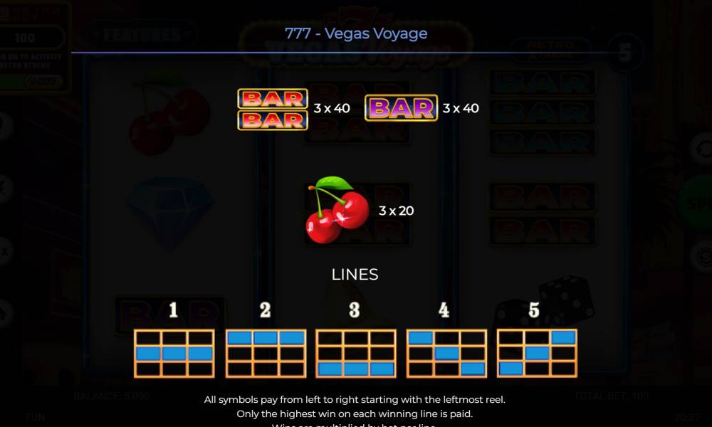 Правила 777 – Vegas Voyage вполне соответствуют ретро-стилистике игрового автомата. Разобраться в них будет очень легко даже полному новичку в гемблинге. Игровое поле состоит из 3 барабанов в 3 ячейки высотой. Схема 3х3 считается самой старой в слотах и использовалась еще в механических одноруких бандитах. Во время вращений разыгрывается 7 обычных знаков и 1 специальный. Три семерки принесут бонус в виде десятикратного увеличения выигрыша за выпадение 3 штук при активированной функции Retro Bet. Фриспины не реализованы в слоте и именно их мне не хватает для того, чтобы поставить максимально высокий балл игре. Ставка выбирается пользователем из диапазона до 100 евро.