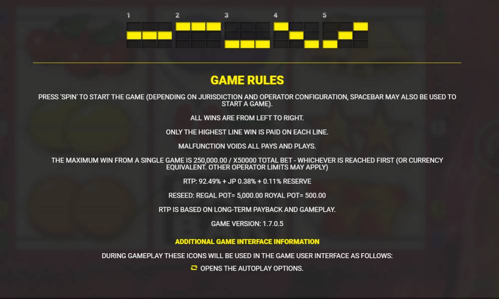 Игровое поле онлайн слота имеет сетку 3х3. Поэтому приз дается исключительно за 3 одинаковых знака. Линий для выплат фиксировано 5. Награда зависит от ставки пользователя. За вишни, лимоны, апельсины и сливы игрок получает х8, за арбузы и BAR — х20, за колокольчики и звезды — х40, за семерки на белом фоне — х100, а на огненном фоне — х250. Выплаты очень крупные, поэтому редкие. Диапазон ставок на спин широкий — 0.1-100 евро. В игре присутствует одна бонусная функция и раунд джекпотов. Максимальный выигрыш за спин составляет х50000 от ставки.