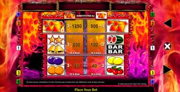 В онлайн-слоте 7`s Deluxe Jackpot King классическое игровое поле 3х3. Линий для выплат фиксировано 5. Выигрыши начисляются за 3 одинаковых символа. Вишни, лимоны, сливы и апельсины приносят х40 от ставки, BAR и арбузы — х100, звезды и колокольчики — х200, семерки на белом фоне — х500, а пылающие 77 — х1250. Но нужно помнить, что выплаты идут из расчета ставки на линии, а игрок выбирает сумму на спин. Поэтому она будет делиться на 5, а уже потом умножаться на количество составленных цепочек. На спин можно делать ставку от 0.25 до 125 евро. Такой диапазон позволяет играть новичкам, которые только осваиваются, и хайроллерам, желающим быстро подняться в высокодисперсном слоте. Максимальный выигрыш составляет х1250 от суммы в базовой игре, но гораздо больше, если пользователь получает джекпот. Из дополнительных возможностей предусмотрен только раунд с прогрессивными джекпотами. Других бонусов, фриспинов, риск-игры в автомате нет.