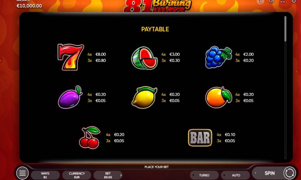 Онлайн-слот 81 Burning Ways предлагает интересную игру на поле с 4 барабанами в 3 ряда и 81 выигрышной линией. Диапазон ставок – от 0.05 до 100 евро. Выплаты производятся за комбинации одинаковых символов, которые должны располагаться на соседних барабанах подряд, начиная с крайнего левого. Если на игровом поле появляется более 3-х одинаковых символов, к сделанной ставке применяется множитель, размеры которого указаны в таблице выплат. Максимальное умножение сулит выпадение 4 знаков в виде цифры 7 – в этом случае игрок может увеличить свою ставку в 160 раз.