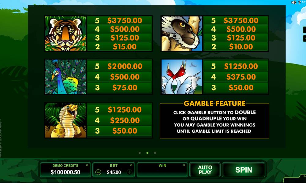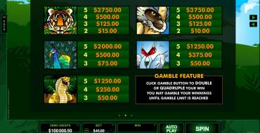 У этого слота красочный интерфейс. Мы можем увидеть всех невероятных зверей, которых мы можем встретить по пути в нашем путешествии. Символы карт оплетены растениями, впрочем как и название игры, которое можно увидеть в нижней части интерфейса. По обе стороны от логотипа (названия игры) можно увидеть кнопку «View Payout». Нажав на неё, вы войдете в другую вкладку, где увидите все выигрышные комбинации и узнаете, какие выплаты вам полагаются за них.