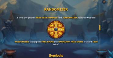 • Randomizer – Если на экране оказываются пять из шести скаттеров, запускается Randomizer. Он имеет вид вращающегося барабана с секторами. С его помощью можно обычные спины превратить в Ragnarok Free Spins или получить бонус, достигающий одной тысячи монет.