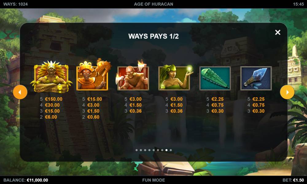 Игровое поле слота Age of Huracan от провайдера Kalamba Games представлено классической сеткой 5х4. Все выплаты осуществляются по 1024 линиям.