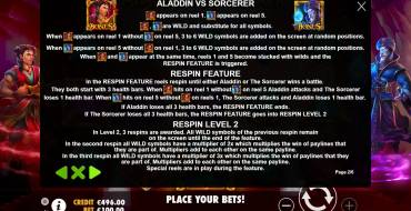 В игровом аппарате Aladdin and the Sorcerer задействованы пять базовых символов, джокеры-скаттеры и бонусный раунд в виде респинов и поединка героев.