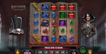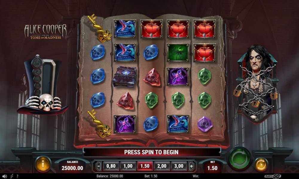 Игровое поле у слота Alice Cooper and the Tome of Madness от провайдера Play'n Go состоит из 5 барабанов по 5 символов. Выплаты производятся по системе Cluster Pays.