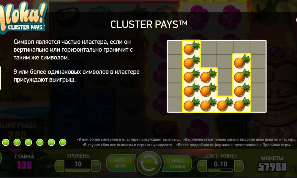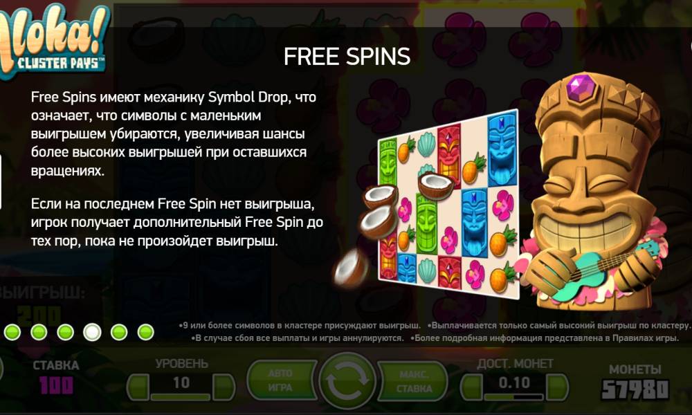 Слот Aloha: Cluster Pays предлагает специальные символы, респины, фриспины и дополнительные призовые опции.
