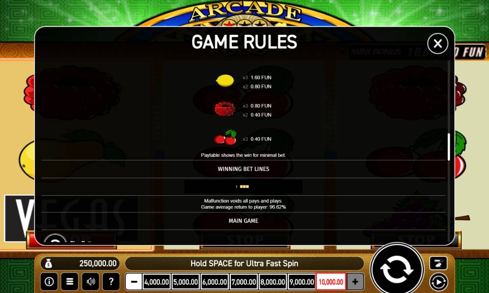 Слот Arcade — это классический онлайн слот с тремя барабанами и одной игровой линией. Выигрышные комбинации формируются при совпадении трех одинаковых символов на линии, начиная с первого барабана. Диапазон ставок варьируется от 0.2 монет до 10000 монет за одно вращение, что позволяет игрокам выбирать комфортный уровень риска. Максимальный выигрыш составляет 409х от суммы ставки. В слоте также доступна риск-игра, где после любого выигрыша игрок может удвоить сумму, угадав цвет карты.
