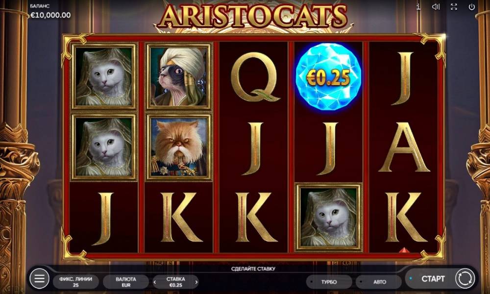 В слоте Aristocats главные действующие лица – не аристократы, а коты, но столь же благородные и вальяжные. В кошачьем царстве разыгрываются солидные суммы, а получить их можно благодаря бесплатным вращениям с расширяющимися по-королевски символами, крупным множителям, бонусной функции с джекпотами и классической риск-игре на удвоение.