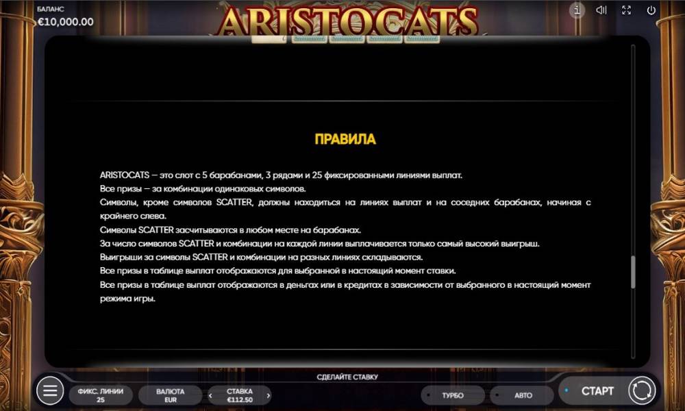 Видеослот Aristocats имеет 5 барабанов в 3 ряда и 25 фиксированных линий выплат. Размер ставки варьируется от 0.25 до 112.5 монет. Выигрышные комбинации образуются из 3 и более одинаковых символов, которые должны располагаться слева направо и начинаться с крайнего левого барабана. Самые большие выплаты получаются при выпадении 5 символов Wild или Scatter, последний засчитывается в любом месте барабанов. Максимальный множитель в этом случае составит х20, другие символы дают от х0.2 до х6 к ставке.