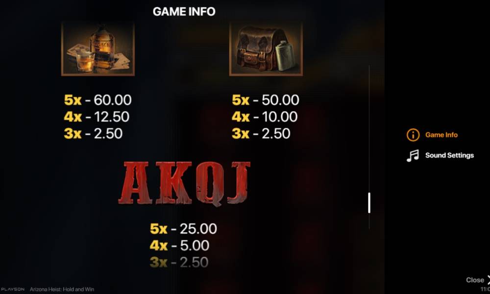 В Arizona Heist: Hold and Win применена стандартная на сегодняшний день схема для игрового поля, 5х4. По мнению многих игроков при достаточном количестве линий она намного интереснее, нежели классическая раскладка 5х3. Составление выигрышных комбинаций осуществляется по таблице выплат, слева направо. Количество оплачиваемых направлений зафиксировано на 25. Ставки устанавливаются из диапазона от 0.2 у.е. до 100 у.е., а максимальный выигрыш, который может предложить слот составляет х14100.