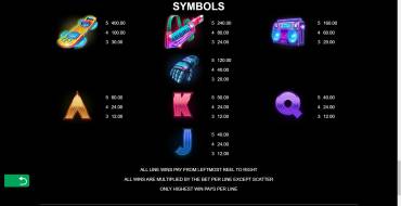 На барабанах нарисованы предметы, одновременно напоминающие о прошлом и наводящие на мысли о будущем: летающий скейтборд, механическая рука, клавишный инструмент и кассетный магнитофон. Также появляются буквы J, Q, К и А, выдержанные в неоновом стиле. Иконки одного вида могут выпадать вертикальными стеками, но это происходит не всегда.