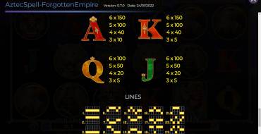 Игровой автомат Aztec Spell Forgotten Empire от провайдера Spinomenal имеет стандартное поле 6x3. Выплаты производятся по 25 линиям.