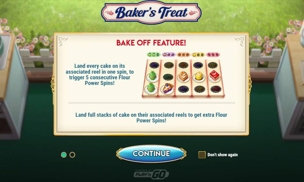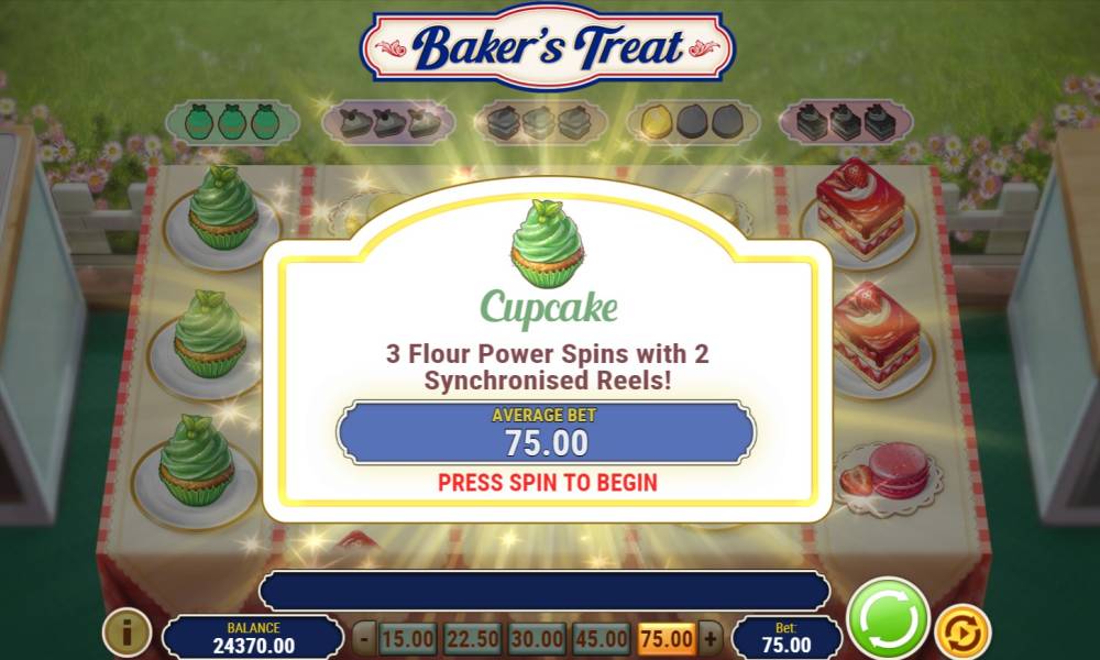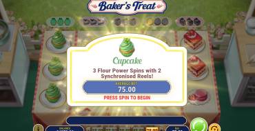 В данной видеоигре есть 2 функции бесплатных вращений - вращения Flour Power и Baker's Treat. Чтобы запустить эти призовые раунды вам необходимо, чтобы разнообразные мучные сладости образовывали комбинации из трех одинаковых пирожных идущих стеками.