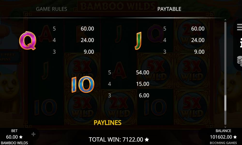 Bamboo Wilds — это слот производства студии Booming Games. Выпущен в середине лета 2023. Тематика — азиатская культура. Слот имеет маленькое поле и платит по фиксированным линиям слева направо. У него высокий РТП и большой лимит на выигрыш — выплата может дойти до х7000. Бонусный функционал маленький, включает только фриспины и 2 дополнительных свойства у Wild-символа.