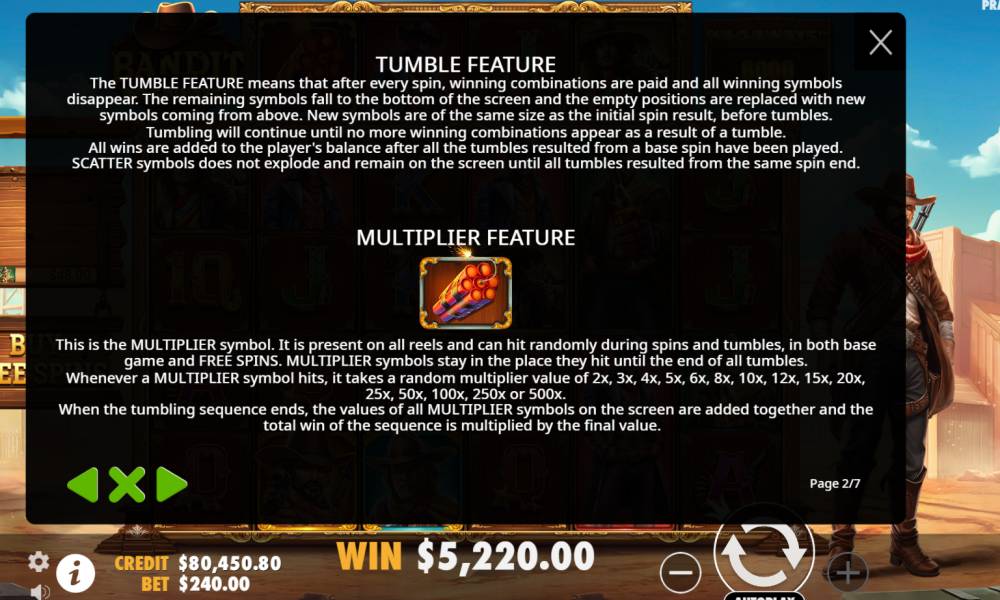 • Multiplier Symbol может появляться как во время обычных вращений и каскадных выпадений (Tumbles), так и в режиме бесплатных спинов. Его значение варьируется от x2 до x500, и он остается на экране до завершения каскадных выпадений. После окончания серии Tumbles все множители на экране суммируются, и общий выигрыш умножается на полученное значение