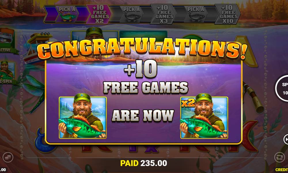 При выпадении 3, 4 или 5 символов Scatter игрок получает 10, 15 или 20 бесплатных вращений соответственно. Во время них на поле будут выпадать рыбаки. Помимо того, что они ловят окуней и дают призы, мужчины еще и зачисляются в специальный счетчик. При достижении определенного количества шагов по шкале пользователь может вновь сыграть в раунд Pick a Fish, а также получить фриспины и множители. Каждые три символа Wild добавляют 5 вращений и по очереди применяют Multipliers — х2, х3, х5 и х10. Множители увеличивают только призы за рыб, которые ловит символ Wild.