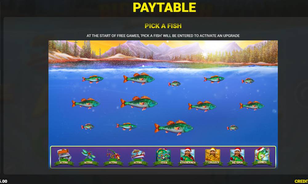 Pick a Fish. Перед началом фриспинов пользователю предлагается половить рыбу. Каждая из них содержит бустеры — увеличение частоты выпадения денежных знаков, дополнительная возможность поучаствовать в рыбалке, больше золотых рыбаков на поле и т.д. Как только игрок попадет на рыбку с надписью «Start Free Games», начнутся фриспины. Накопленные бустеры будут действовать во время этих бесплатных вращений.