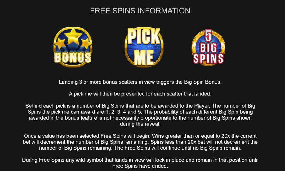 Big Spin Bonus. Функция запускается, когда на поле на любых ячейках появятся 3+ символа Bonus. После этого каждый Bonus превращается в символ с надписью Pick Me. Под этими знаками скрыты цифры от 1 до 5. Гемблеру нужно выбрать 1 из знаков. Число, которое под ним скрыто, означает количество бесплатных вращений. Вращения происходят по тем же правилам, что и простая игра. Если во вращении выигрыш равен или превышает множитель х20 — счетчик вращений уменьшается на 1. Если выигрыш меньше х20 — вращений остается столько же, сколько выиграл гемблер.