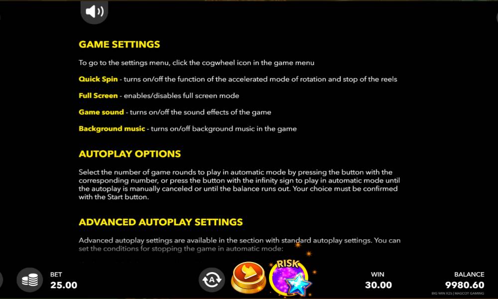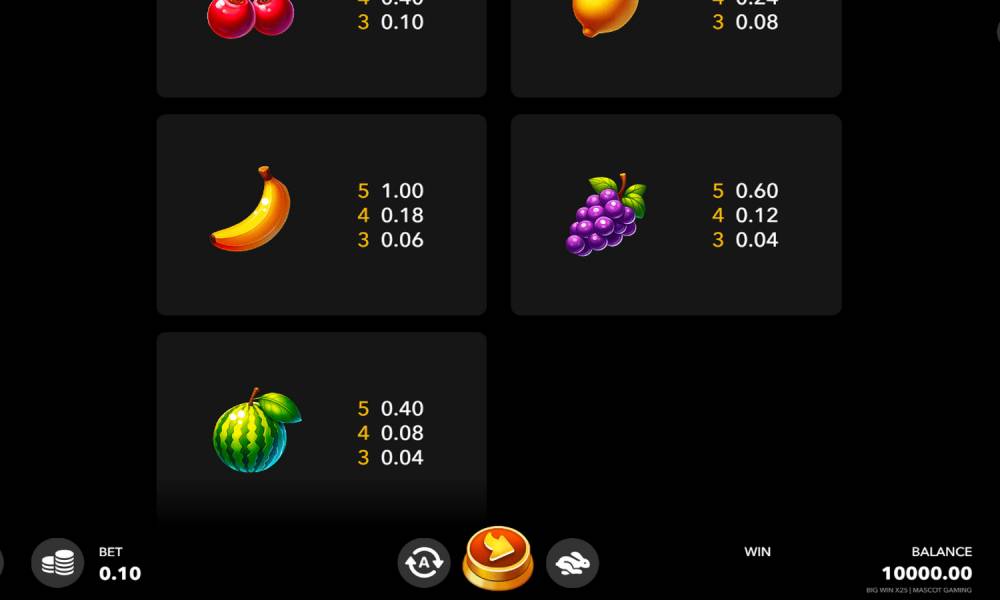 В деморежиме можно поиграть в Big Win X25 бесплатно, чтобы понять, интересен ли игровой процесс. Демоверсия работает без регистрации. Ее можно запустить в любом казино, где есть этот слот, или прямо на этой странице вверху.
