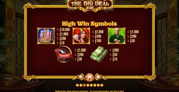 Окунитесь в мир роскоши и огромных денег в слоте The Big Deal Deluxe. Представительные мужчины, обольстительные женщины, драгоценности и автомобили премиум класса ждут в Лас-Вегасе, чтобы подарить незабываемую атмосферу азарта настоящих лучших казино планеты.
