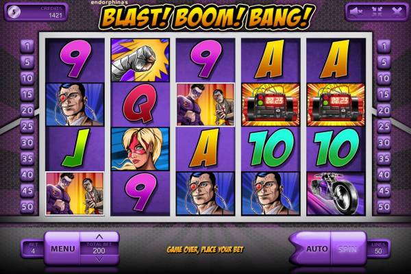 На экране игрового автомата Blast! Boom! Bang! появляются картинки с изображением разных героев комиксов (описывать их не будем), а также кулака в момент удара, мотоцикла и разноцветных номиналов игральных карт. Особые функции выполняют Wild (взрывчатка с часовым механизмом) и Scatter (сцена из комикса с двумя персонажами). Эти элементы могут следующее: