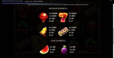 Игровой автомат Book Of Diamonds Reloaded от провайдера Spinomenal имеет классическое поле, состоящее из 5 барабанов по 3 символа в каждом. Количество линий фиксированное и изменить его нельзя – 5 линий.