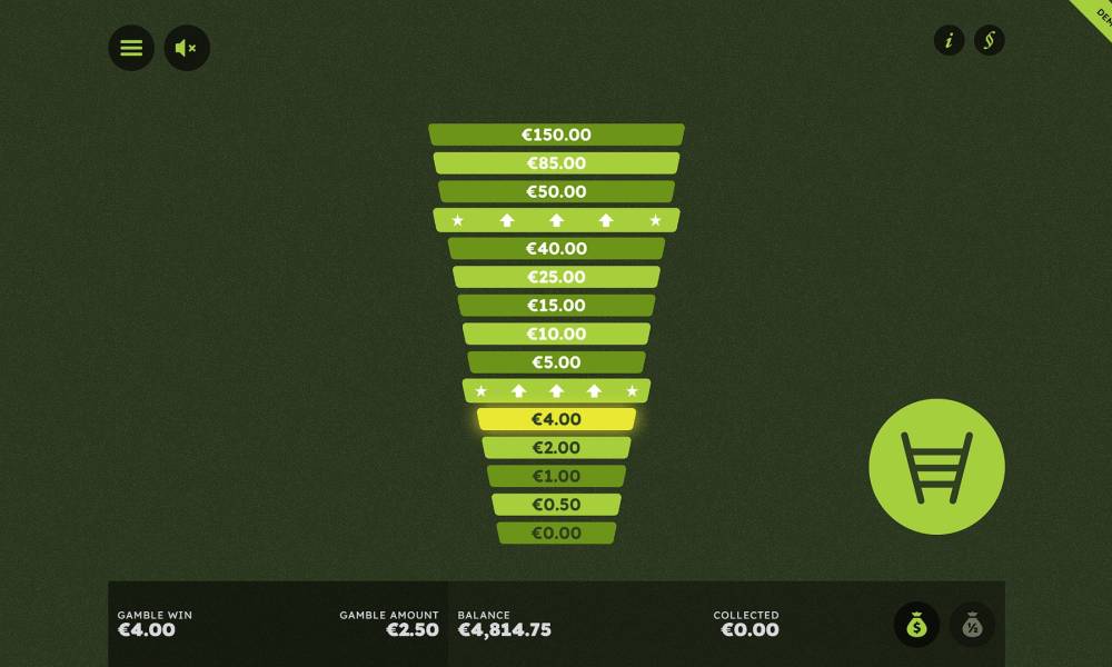 Раунд с лестницей. На каждой ступеньке сумма, в два, четыре, восемь и т.д. раз превышающая выигрыш за спин. Можно взбираться вверх и в любой момент забрать деньги, а можно все потерять, если подсветка остановится на значении 0.