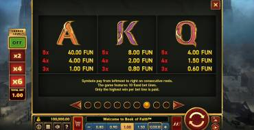 В слоте Book of Faith вам предлагают 5 барабанов и 10 активных линий, которые фиксированы. Чтобы выиграть, нужно собрать одинаковые символы на соседних барабанах, начиная с первого слева. Размер ставки равен от 0,2 монеты до 10 000. Вы сами выбираете, насколько готовы рисковать. Максимальный выигрыш при лучшем исходе игры принесет до 5000 множителей ставки. Фриспины активируются, если на поле выпадает от 3 до 5 символов книги, которые выполняют функцию Wild и Scatter одновременно. Для счастливчиков открывается и риск-игра, где можно удвоить свои выигрыши.