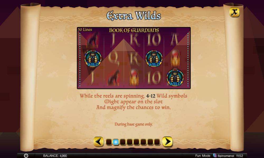 В Book of Guardians представлены базовые картинки, джокер, скаттеры, респины, фри-спины, дополнительные множители и другие опции геймплея.