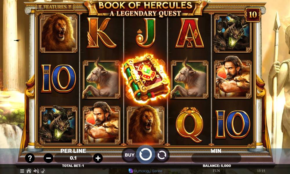 Игровое поле Book Of Hercules – A Legendary Quest включает пять барабанов с тремя рядами символов, а выигрышные комбинации формируются по 10 фиксированным линиям. В стандартном режиме для получения выигрыша необходимо собрать минимум три одинаковых символа подряд, начиная с крайнего левого барабана. В бонусных раундах активируется механика Special Expanding Symbol, благодаря которой случайно выбранный символ расширяется и засчитывается независимо от своего положения. Тут уже нужно буде 2 старших и 3 младших знака минимум для комбинации. Всего в игре представлены четыре старших, пять младших и один специальный символ. Высокая волатильность оправдывается возможностью сорвать крупный выигрыш в х5000. Фриспины имеют возможность ретриггера.