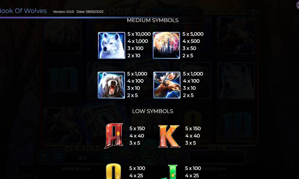 Игровое поле слота Book Of Wolves Full Moon от провайдера Spinomenal представлено 5 барабанами по 3 символа в каждом. Все выплаты осуществляются по 5 фиксированным игровым линиям.