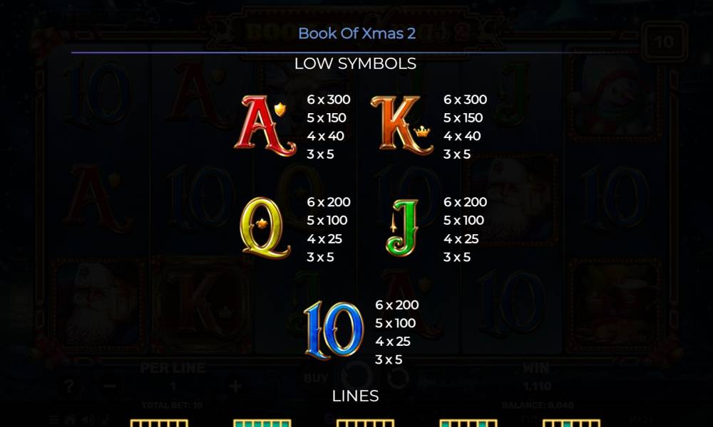 Игровое поле в слоте Book Of Xmas 2 уникально. Оно состоит из 6 барабанов, каждый из которых имеет высоту в 3 клетки. Для формирования выигрышей предусмотрены 10 фиксированных линий. Комбинации формируются по направлению с первого барабана слева направо. В игре участвуют 9 стандартных символов и один специальный, обладающий двойной функцией, что характерно для "книжной" механики. Размер ставки можно выбрать в пределах от 0,1 до 100 евро. В режиме фриспинов добавляется бонус — случайно выбираемый суперсимвол, который действует в течение текущего раунда. Для комбинаций с участием Special Expanding Symbol подход отличается: для старших знаков достаточно собрать лишь 2 штуки, а для младших требуется минимум 3 (местоположение их не имеет значения).